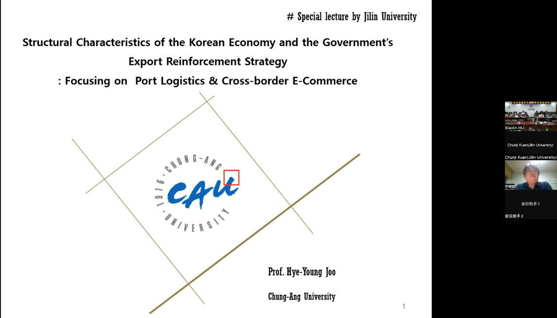 On November 3rd, 2022, the lecture "Structural Characteristics of the Korean Economy and the Government's Export Reinforcement Strategy: Focusing on Port Logistics and Cross-border E-Commerce" of the High-End Symposium on Northeast Asia International and Regional Studies was successfully held at Jilin University. The lecture was jointly organized by the Northeast Asian Research Center of Jilin University, the Northeast Asian Studies College of Jilin University, the Institute of North and South Korean Studies of Jilin University, and the Special Committee for Northeast Asian Regional Studies, Academic Association for International Cultural Exchange. The lecture was held simultaneously both as an online lecture and in person. The College of Northeast Asian Studies invited Professor JOO Hye-Young from the Department of International Trade and Logistics of Chung-Ang University to give an insightful lecture. At the beginning of the lecture, the host, Professor Xuan Chunji of the Northeast Asian Studies College of Jilin University, on behalf of Prof. Wu Hao, Dean of the Northeast Asian Studies College of Jilin University, extended a warm welcome and high appreciation to Professor JOO Hye-Young.
