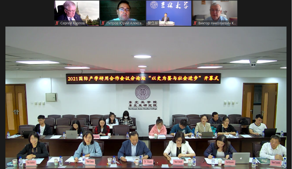 On September 15th , Learning from History and Progress with Society, a sub-forum of the 2021 International Conference on Cooperation in Industry, Academia, Research and Application(Changchun), was held at Jilin University, Humanities and Social Sciences Key Research Base of Ministry of Education, co-organized by the Northeast Asian Research Center of Jilin University, Northeast Asian Studies College of Jilin University, and Jilin University-Moscow State University History Research Center. Professor Cai Lidong, Vice President of Jilin University, Professor Wu Hao, Director of Northeast Asian Studies College and a professor of Kuang Yaming Distinguished Professor of Jilin University, Professor Zhang Guangxiang, Director of the Jilin University-Moscow State University History Research Center and a professor of Kuang Yaming Distinguished Professor of Jilin University, Academician С.P. Karpov, member of the Russian Academy of Sciences, Chairman of the Council of Heads of History Departments of Russian Universities, former Dean of Faculty of History, Moscow State University, Meritorious Professor, Honorary Professor of Jilin University, Academician Л.I. Borodkin, Corresponding Member of the Russian Academy of Sciences, Deputy Head of Faculty of History, Moscow State University, Honorary Professor of Jilin University, Professor С.V. Mironenko, Corresponding Member of the Russian Academy of Sciences, Russian State Archives Director, Professor Ю.A. Petrov, Director of the Institute of Russian History, Russian Academy of Sciences attended the forum. The opening ceremony of the forum was hosted by Professor Wu Hao.