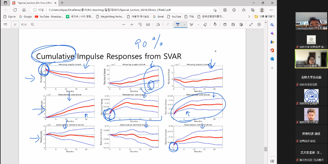 In the first part of the lecture, Prof. Park introduced in detail the structural vector autoregression (SVAR) model, the SVAR model under short-term restrictions, the SVAR model under long-term restrictions, the SVAR model under sign restrictions, and the SVAR model under shock-based restrictions. In the second part of the lecture, Prof. Park introduced the Korean power tax system and its impact on the Korean real estate market. In the third part of the lecture, Professor Park introduced the process of empirical research and analysis of the Korean real estate market using the SVAR model. Finally, Professor Park explained the recent development of the Korean real estate market in terms of supply shocks, real demand and speculative demand based on the results of the study.