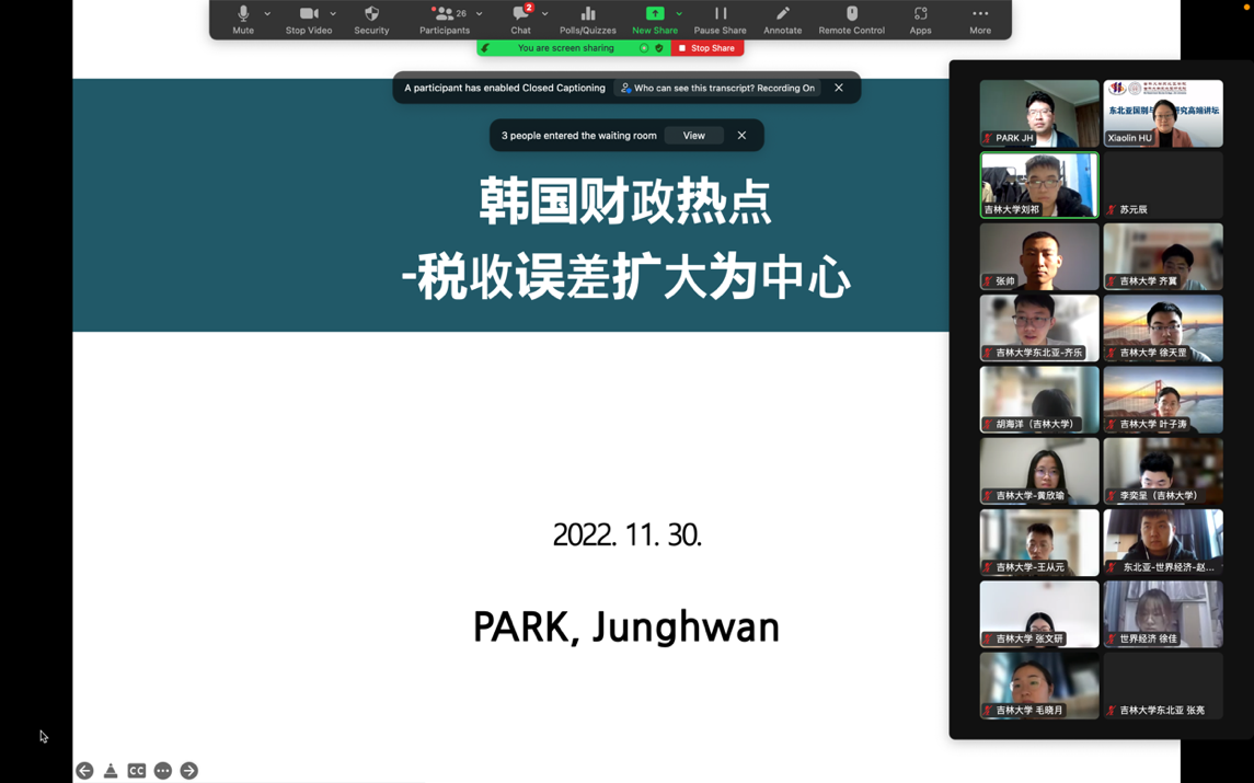 A lecture on "National Tax Revenue and Hot Topics of Fiscal Soundness in Korea" of the High-End Symposium on Northeast Asia International and Regional Studies was successfully held at Jilin University on November 30th, 2022. The lecture was jointly organized by the Northeast Asian Research Center of Jilin University, the Northeast Asian Studies College of Jilin University and the Special Committee for Northeast Asian Regional Studies, Academic Association for International Cultural Exchange. The Northeast Asian Studies College of Jilin University invited Dr. PARK Jung Hwan, a researcher from the Budget Office of the National Assembly of Korea, to deliver the lecture. Associate Professor Xuan Chunji of the Northeast Asian Studies College of Jilin University hosted the lecture.