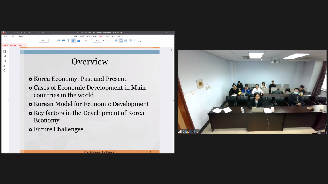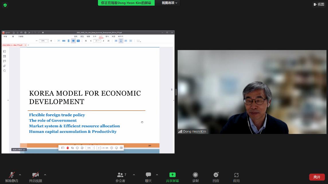 In the first part of the lecture, Pro. Kim selected indicators such as GDP growth rate, inflation rate, investment savings rate, and unemployment rate to describe the development of the Korean economy; in the second part of the lecture, Pro. Kim showed that Korea's development cannot be achieved without the support of economic policies and pointed out that each developing country must choose its own development path according to its own national conditions; in the last part, Prof. Kim introduced the challenges for the future development of the Korean economy, namely, the aging population will have a negative impact on the Korean economy.