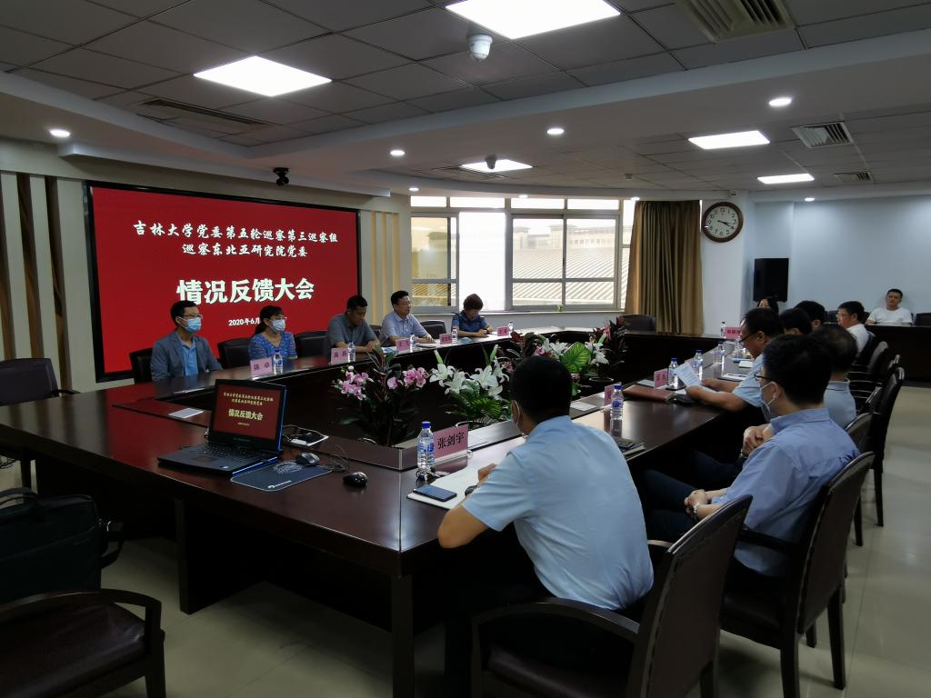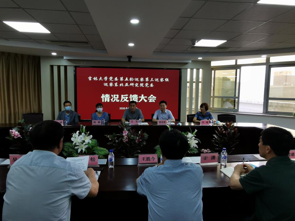 根据学校党委关于巡察工作的部署,2020年6月29日15时,学校党委第三巡察组向东北亚研究院党委反馈巡察情况。学校巡察工作领导小组成员王飞、党委第三巡察组组长赵光军及全体成员、学院领导班子全体成员,哲学社会科学资深教授王胜今教授,近三年退出管理岗位的班子成员,党委委员、纪委委员、学术委员会主任、学位评定委员会主任,支部书记、各研究所所长,教职工代表等参加了会议。会议由东北亚研究院党委书记邱松主持。