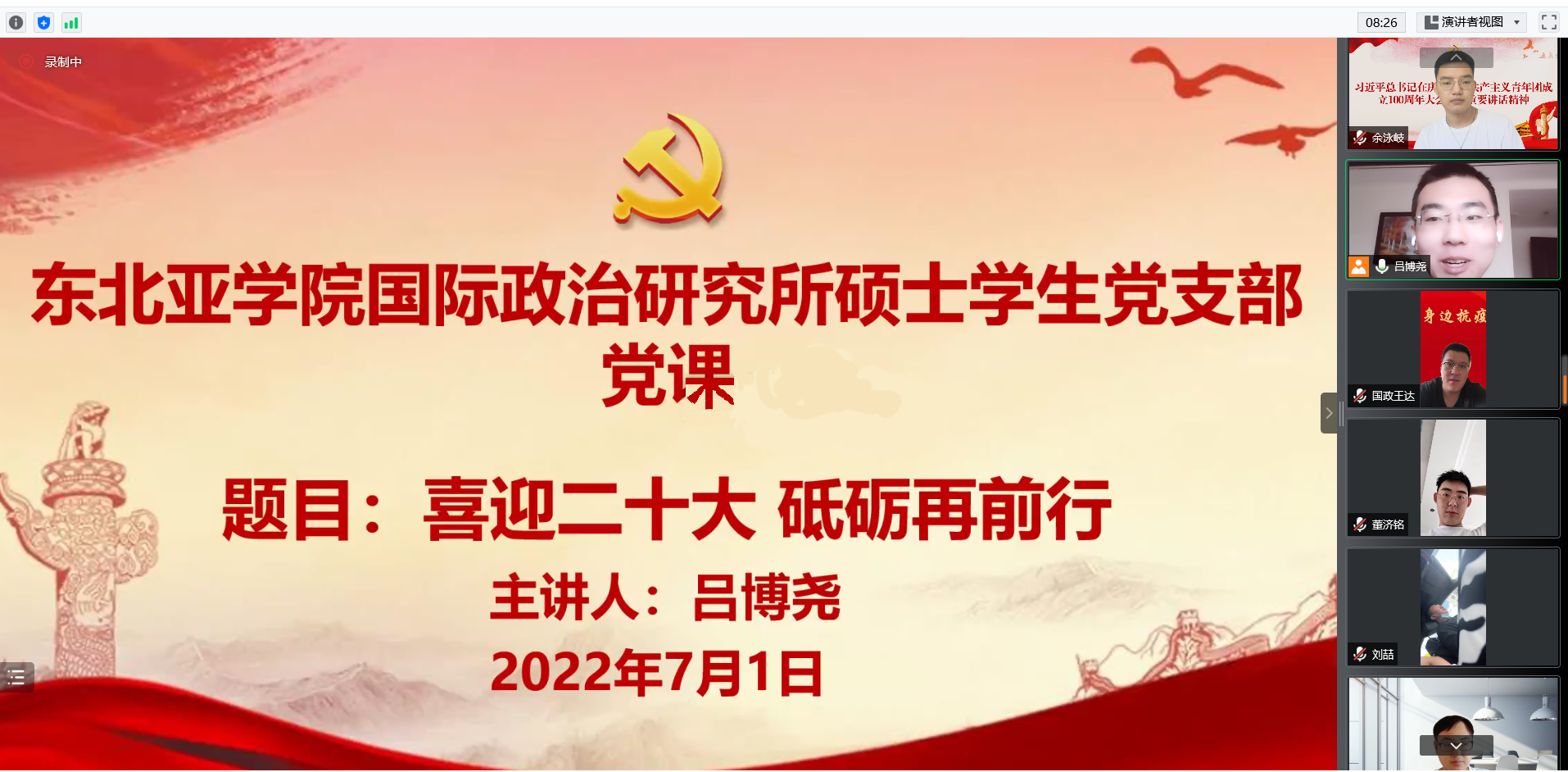 为弘扬伟大建党精神,庆祝中国共产党成立101周年,迎接党的二十大胜利召开,激励广大学生党员牢记初心使命、赓续红色血脉,踔厉奋发、勇毅前行。2022年7月1日至7月6日,海角视频 党委硕士学生党支部集中开展了“党课开讲啦”活动,组织全体硕士学生党员开展了理论学习和研讨,支部书记带头讲党课,引导广大党员深刻领悟习近平新时代中国特色社会主义思想和党的十九届历次全会精神,重温党的光辉历程,激励广大党员砥砺深耕、勇毅笃行,全心全意为党和人民服务,以实际行动迎接党的二十大的胜利到来。