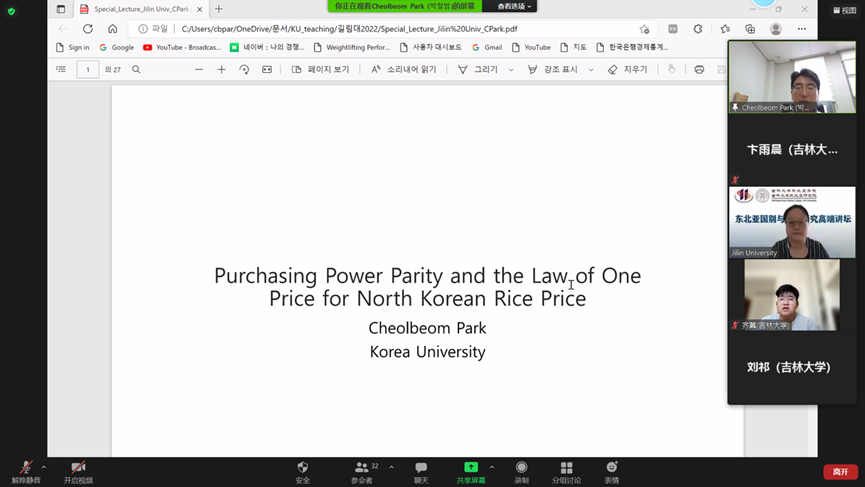 202292日,东北亚国别与区域研究高端讲坛朝鲜大米价格的购买力平价与其一价定律的验证在海角视频 顺利举行。本次讲座由海角视频 东北亚研究中心、海角视频 、东北亚研究院、韩国高丽大学经济系联合举办,因疫情原因在线上开展。海角视频 邀请到了韩国高丽大学经济系朴哲范(Park Cheol Beom)教授,带领中国师生们进行了一次精妙绝伦的学术之旅。讲座由海角视频 玄春姬教授主持和翻译,海角视频 的部分教师、博士与硕士研究生参与了活动。讲座伊始,玄春姬教授代表海角视频 院长吴昊教授向朴哲范教授表示了热烈的欢迎和崇高的谢意。