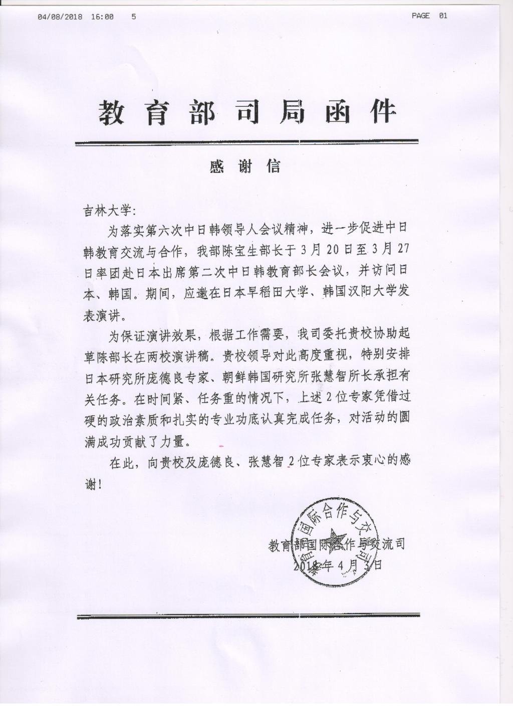 近日教育部国际合作与交流司致信海角视频 ,对东北亚研究院庞德良教授和张慧智教授表示感谢。
