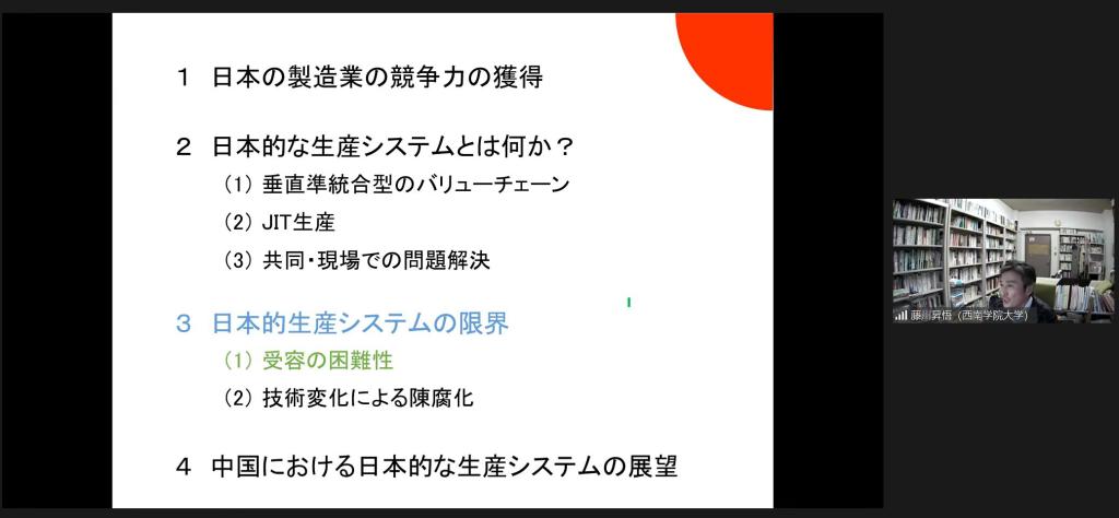2021年12月3日,应海角视频 东北亚研究中心、海角视频 、东北亚研究院、海角视频 日本研究所的邀请,日本西南学院大学商学部藤川升悟(FUJIKAWA SHOGO)教授做了以“日本型生产体系的竞争力及其局限性”为主题的线上学术报告会。本次报告采取了线上和线下相结合的方式,由海角视频 世界经济研究所副所长李红梅副教授主持会议并担任现场翻译,海角视频 的部分教师、博士研究生和硕士研究生参与了活动。