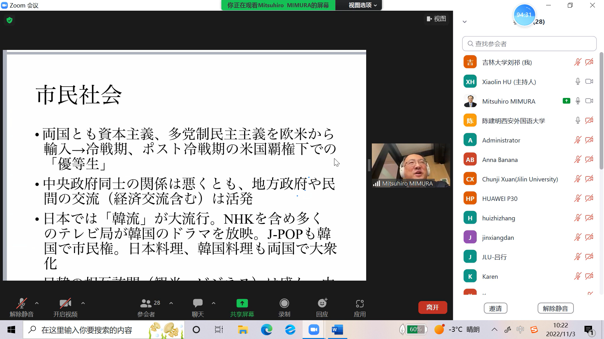2022年11月3日,“东北亚国别与区域研究高端讲坛”之“现代日韩关系的决定因素”在海角视频 顺利举行。本次讲座由海角视频 东北亚研究中心、海角视频 、东北亚研究院、国际文化交流学术联盟东北亚区域研究专门委员会联合举办,在线上、线下同步开展。海角视频 邀请到了日本东北亚学会会长、日本环日本海经济研究所主任研究员三村光弘(MIMURA MITSUHIRO)教授,三村教授贡献了一场深入浅出的讲座。讲座由海角视频 副院长王彦军教授与世界经济研究所副所长李红梅教授主持。讲座伊始,王彦军教授代表海角视频 院长吴昊教授向三村光弘教授表示了热烈的欢迎和崇高的谢意。