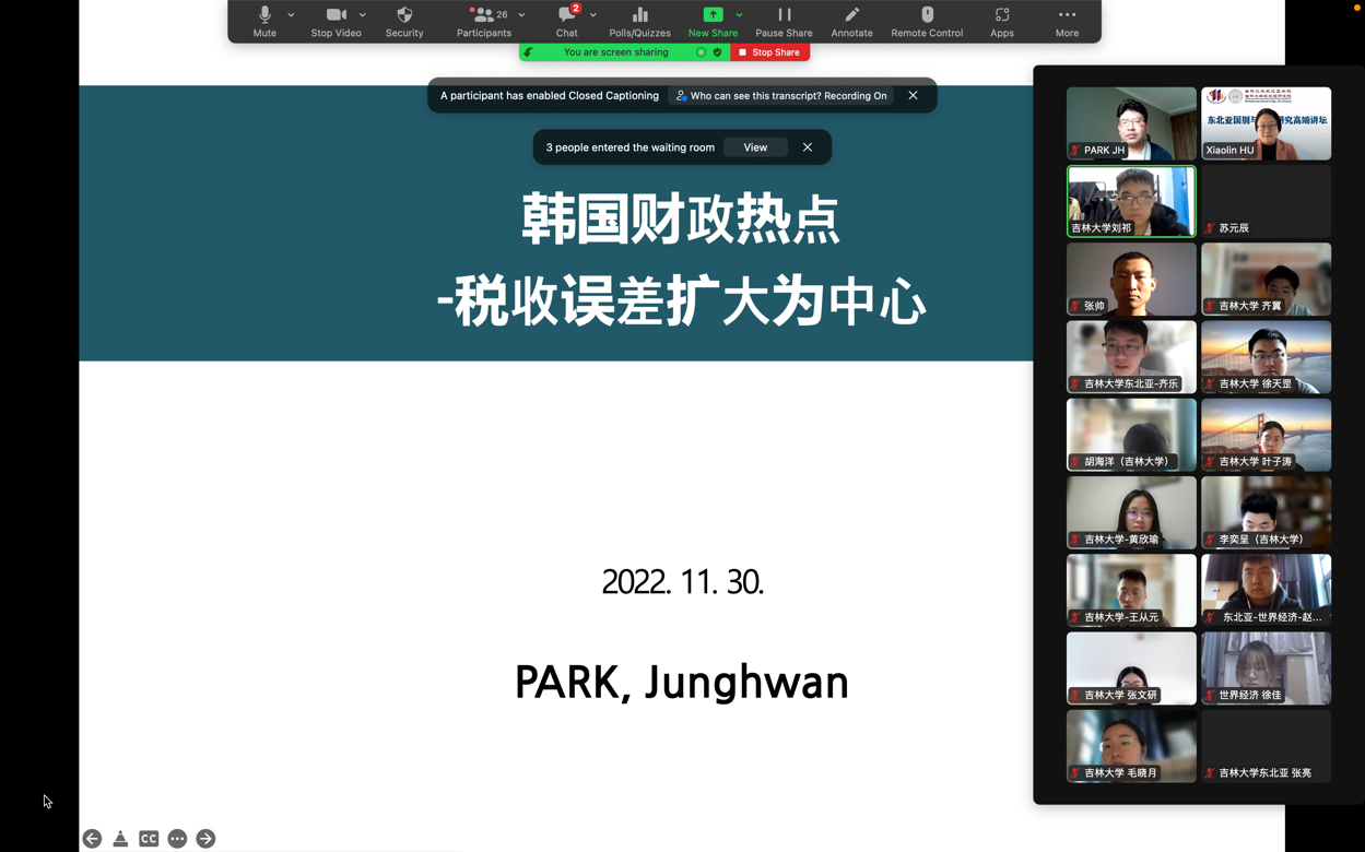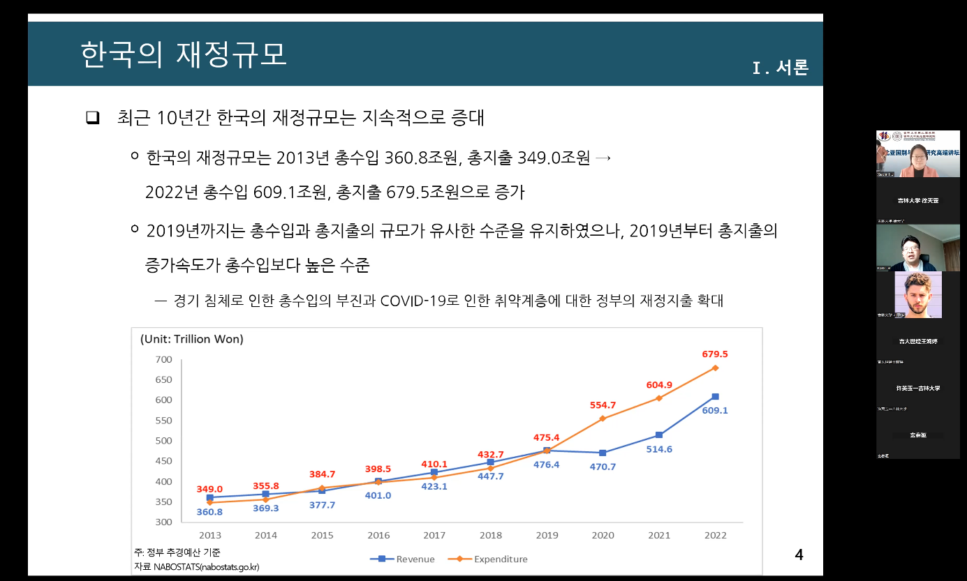 2022年11月30日,“东北亚国别与区域研究高端讲坛”之“韩国的国税收入和财政健全性热点”在海角视频 顺利举行。本次讲座由海角视频 东北亚研究中心、海角视频 、东北亚研究院、国际文化交流学术联盟东北亚区域研究专门委员会联合举办。海角视频 邀请到了韩国国会预算政策处研究员——朴正焕(PARK Jung Hwan)博士来进行讲座。讲座由海角视频 副教授玄春姬主持。