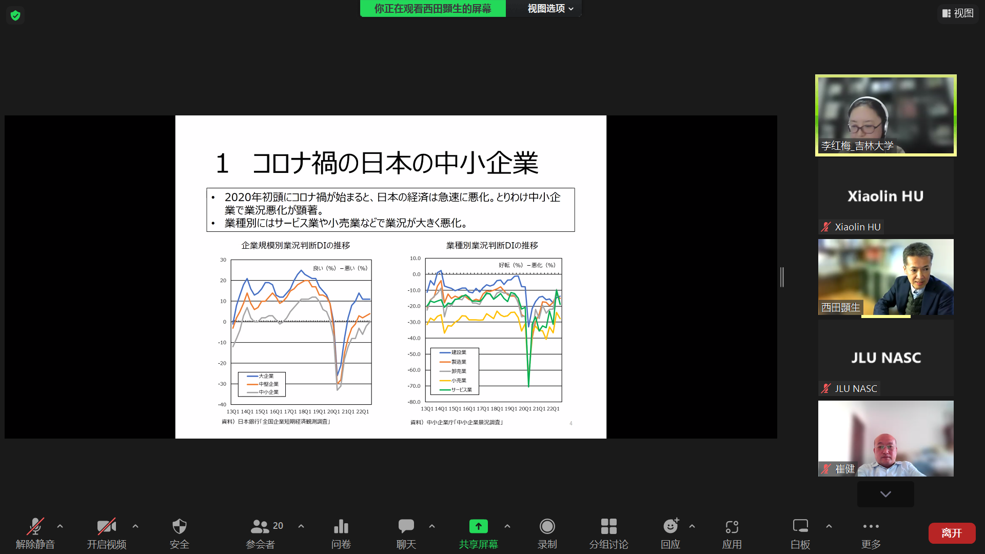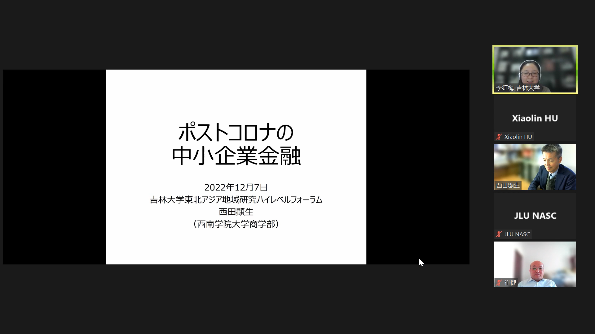 2022年12月7日,应海角视频 东北亚研究中心、海角视频 ·东北亚研究院、海角视频 日本研究所、国际文化交流学术联盟东北亚区域研究专门委员会的邀请,日本西南学院大学商学部学部长西田显生(NISHIDA AKIO)教授举行了以“后疫情时代的中小企业金融”为主题的线上讲座。本次讲座由海角视频 世界经济研究所副所长李红梅副教授主持。