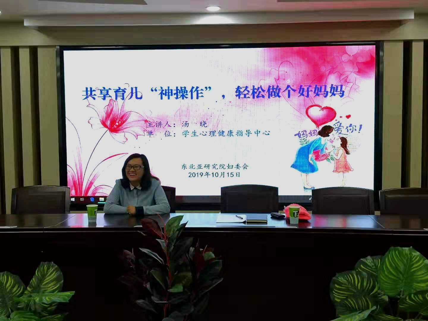 学校“不忘初心、牢记使命”主题教育开展以来,东北亚研究院围绕学校中心工作,深入学习习近平总书记的重要论述和讲话精神。守初心,担使命,不断创新工作思路,本着更好的为女教工服务的初衷,于 2019年10月15日下午,院妇委会邀请心理健康指导中心汤晓老师举办了“共享育儿‘神操作’ 轻松做个好妈妈”幼儿心理健康知识讲座。