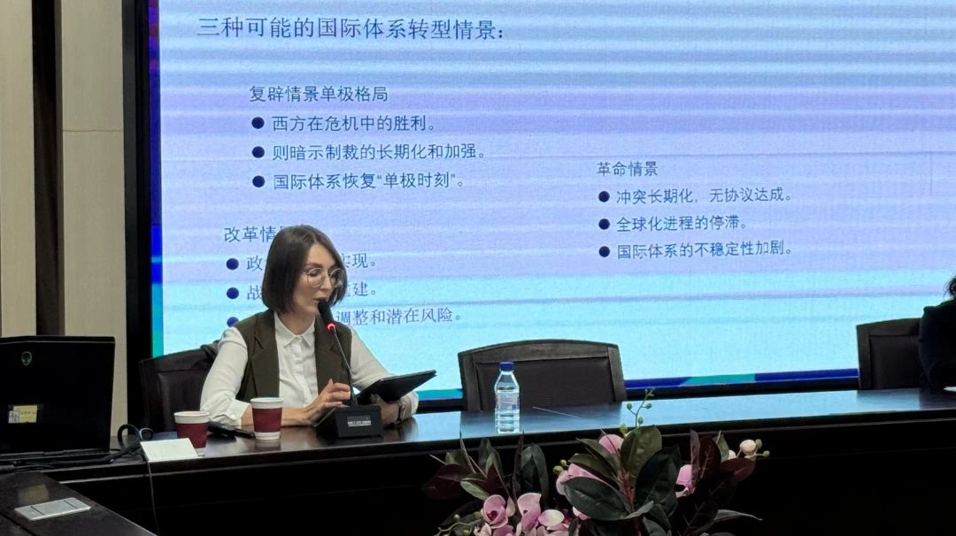 在学术交流阶段,与会专家围绕当前国际热点及区域合作议题进行了深入研。俄罗斯高等经济学院教授Ivanchenko Nadezhda以《俄乌冲突的未来与后果》为报告主题,详细阐述了俄罗斯学界对于俄乌冲突前景的多种观点。她指出,俄罗斯学者普遍认为,俄乌冲突的未来可划分为复辟、改革和革命三种可能的国际体系转型情景。尽管这一冲突在地理上被视为地区性(欧洲)危机,但其引发的后果无疑已具有全球性影响。蒙古国立大学副教授Davaadorj Tumenjargal以《蒙古国议会选举进程(1992-2024年)》为报告主题,介绍了蒙古国民主选举制度的组织流程、选民参与度以及其对蒙古国政治稳定与发展的重要意义。这一分享为与会者提供了深入理解蒙古国政治体系的重要视角。蒙古国教育部教育总司调研专家Tsagaandorj Ariunaa则以《蒙中两国高等教育交流与合作现状,困境与应对》为报告题目,聚焦于蒙中高等教育合作,认为在过去70余年的发展中,双方已形成多元共赢的格局。然而,未来发展仍需应对人才结构、科研合作及办学层次等方面的挑战。她建议通过优化人才培养模式、深化科研合作、提升教育层次及加强文化交流,推动蒙中教育合作迈向更高水平。