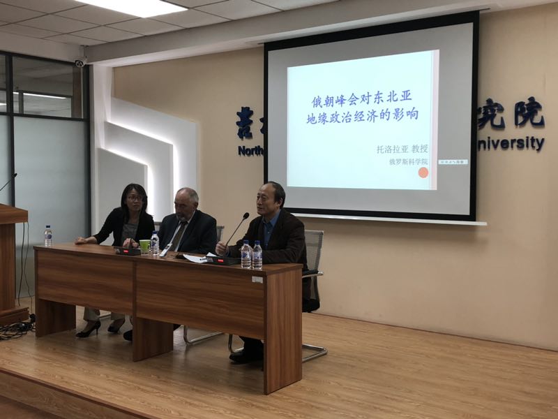 2019年5月10日,俄罗斯著名朝鲜问题的国际权威专家、俄罗斯科学院教授托洛拉亚应东北亚研究院中俄区域合作研究中心的邀请,在东荣大厦B215会议室举办了以“俄朝峰会对东北亚地缘政治经济的影响”为主题的学术报告会。报告由中俄区域合作研究中心主任,朱显平教授主持,外语学院万冬梅老师担任现场翻译。东北亚研究院部分师生参加了报告会。
